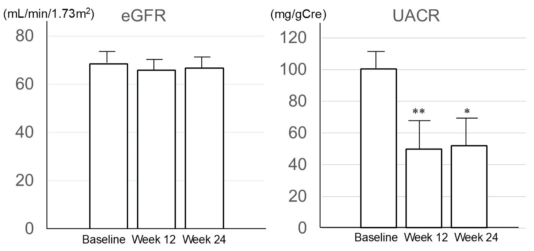 Changes in renal parameters are shown in Figure 1. Although the eGFR did not change over the study period, UACR was significantly reduced at 12 and 24 weeks. At 24 weeks, eight patients had normalized to a normoalbuminuric state (UACR < 30 mg/gCre), and the other 13 patients had improved within the range of microalbuminuria (30 ≤ UACR < 300 mg/gCre).