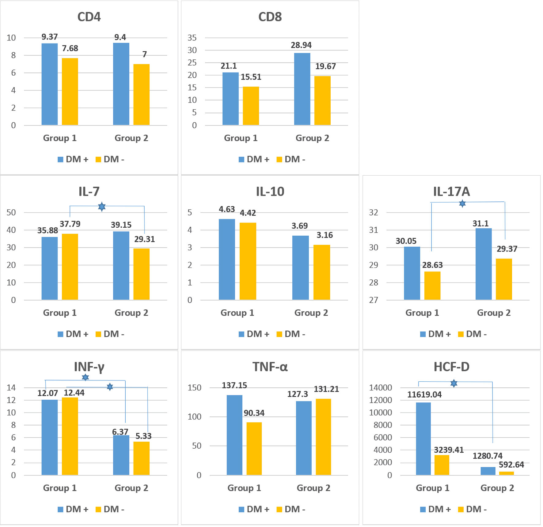 ![]() Click for large image | Figure 2. Immunological parameters (mean values) in patients with DM (DM+) and without DM (DM -) in patients from group 1 (active COVID-19) and group 2 (post-COVID-19 with new-onset carbohydrate disorders). The blue star indicates a statistically significant difference (P < 0.05) between the two subgroups (DM+ and DM-). CD: cluster of differentiation; IL: interleukin; IFN-γ: interferon-gamma; TNF-α: tumor-necrosis factor - alpha; HCFD: human complement factor D; DM: diabetes mellitus; COVID-19: coronavirus disease 2019. |