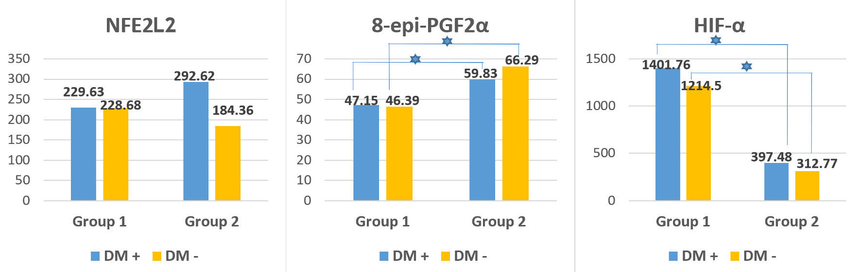 ![]() Click for large image | Figure 3. Oxidative stress, antioxidant defense and hypoxia indicators (mean values) in patients with DM (DM+) and without DM (DM-) in patients from group 1 (active COVID-19) and group 2 (post-COVID-19 with new-onset carbohydrate disorders). The blue star indicates a statistically significant difference (P < 0.05) between the two subgroups (DM+ and DM-). 8-epi-PGF2α: 8-epi-prostaglandyn F2 alpha; NFE2L2: nuclear factor erythroid 2-related factor 2; HIF-1α: hypoxia inducible factor-1 alpha; DM: diabetes mellitus; COVID-19: coronavirus disease 2019. |