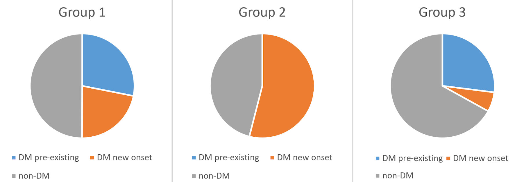 In group 1, a total of 16 individuals (50%) of all those studied had DM, and it was pre-existing in only nine of them (28.13%). The remaining seven individuals (21.87%) had newly diagnosed diabetes (four women and three men, respectively) (Fig. 4).