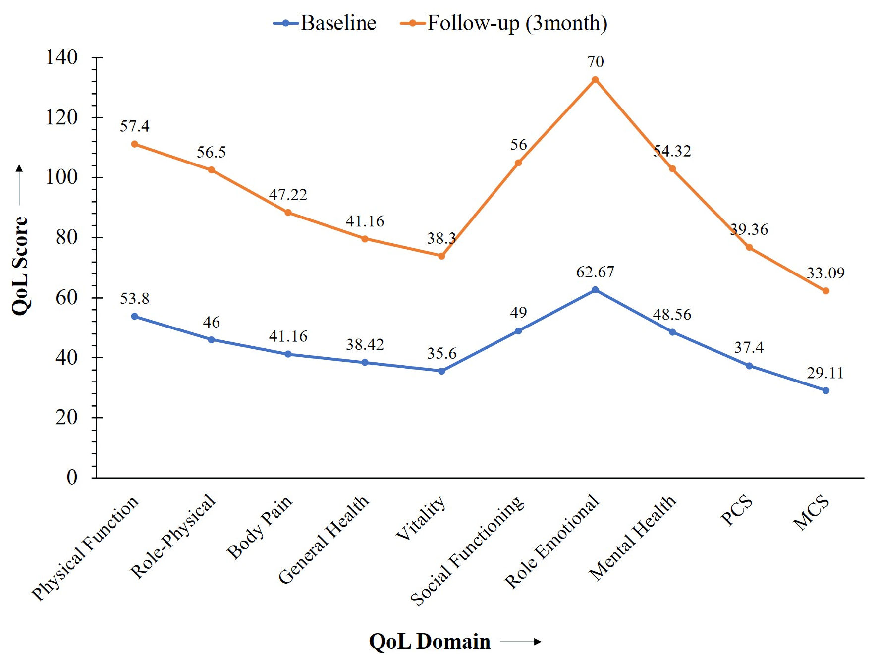 The study evaluated participants’ HRQoL using Short Form-36 (HRQoL-SF-36) score (a validated tool comprising 36 questions that assess physical and mental health components [16, 17]). The results provide two key scores: Physical Component Summary (PCS) and Mental Component Summary (MCS). Each score ranges from 0 to 100, with higher scores indicating better HRQoL. Participants self-administered the questionnaire at baseline to track HRQoL status. The SF-36 is known for its reliability and simplicity and has been extensively used in both clinical and population studies. This score was administered at baseline and at 3 months’ follow-up.