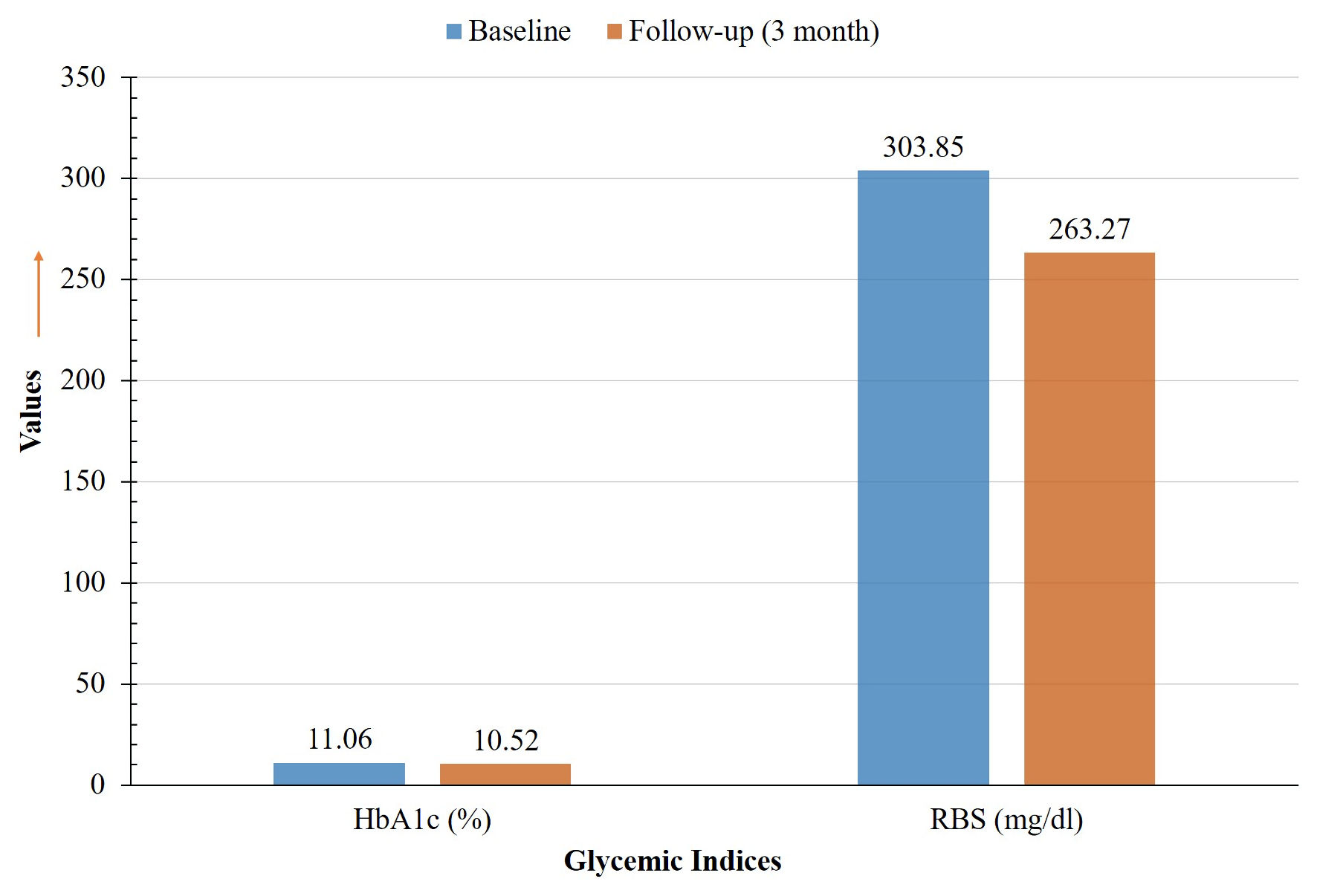Glycemic analysis showed that baseline HbA1c was highest in pancreatic diabetes (12.35 ± 1.1) compared with T1DM (11.07 ± 2.2) and T2DM (10.67 ± 2.2) (P = 0.003). After 3 months, HbA1c showed significant improvement in T1DM (11.07 ± 2.2 to 10.76 ± 2.1, P = 0.042) and T2DM (10.67 ± 2.2 to 9.93 ± 2.8, P = 0.031), whereas the reduction in pancreatic diabetes (12.35 ± 1.1 to 12.05 ± 1.4) was minimal and not statistically significant (P = 0.184). Although the absolute change appeared numerically similar in T1DM and pancreatic diabetes, only the T1DM group demonstrated a statistically significant decline due to greater within-group variability. Random blood sugar also declined significantly in T1DM and T2DM, with minimal change in pancreatic diabetes (P = 0.004) (Table 5). Overall glycemic control improved notably over the 3-month follow-up. Mean HbA1c reduced by 0.54% (from 11.06% to 10.52%, P = 0.002), while random blood sugar showed a 13.4% decrease (from 303.85 mg/dL to 263.27 mg/dL, P < 0.001) (Fig. 2).