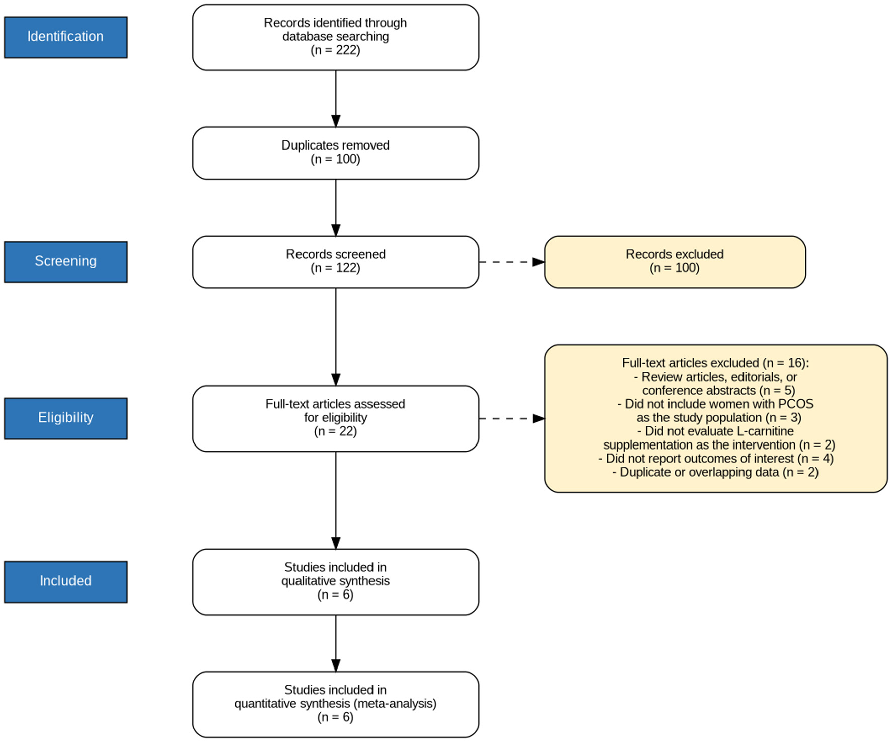 A comprehensive literature search was conducted across four electronic databases (PubMed, Scopus, Cochrane Library, and Web of Science) from inception through May 2025, with no restrictions on language or publication year. The search combined terms related to the intervention (Carnitine OR Levocarnitine OR L-carnitine OR L carnitine) and the condition (Polycystic ovary syndrome OR Polycystic ovarian syndrome OR PCOS OR Stein-Leventhal syndrome OR Stein Leventhal syndrome) using Boolean operators. Two reviewers (SB and MSA) independently conducted the search, with disagreements resolved through discussion and consensus.