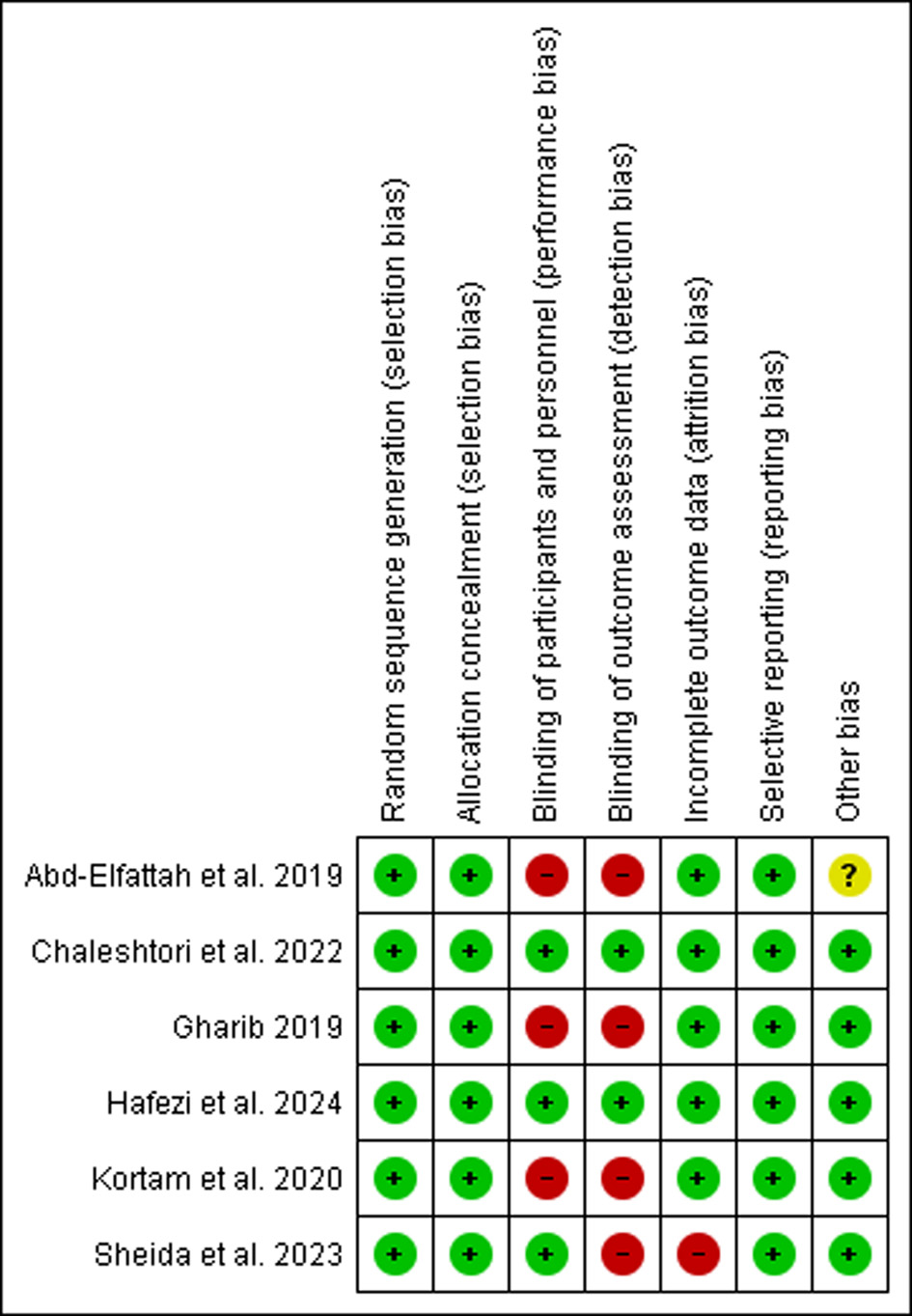 Risk of bias was assessed using the Cochrane Risk of Bias tool (RoB 1) for all six included studies (Fig. 2). All studies demonstrated low risk for random sequence generation, allocation concealment, and selective reporting. However, blinding was inadequate in several trials: three studies had high risk of performance bias [13, 17, 18] and four had high risk of detection bias [13, 17, 18, 20]. Additionally, one trial had high risk for incomplete outcome data [20], and one had unclear risk for other sources of bias [17].