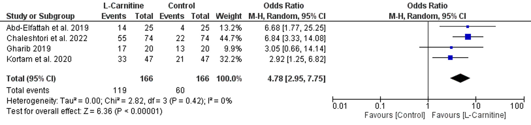 As shown in Figure 3, the ovulation rate was significantly higher in the L-carnitine group compared with the placebo group (OR = 4.78, 95% CI 2.95–7.75, P < 0.001). The included studies demonstrated low heterogeneity (P = 0.42, I2 = 0%).