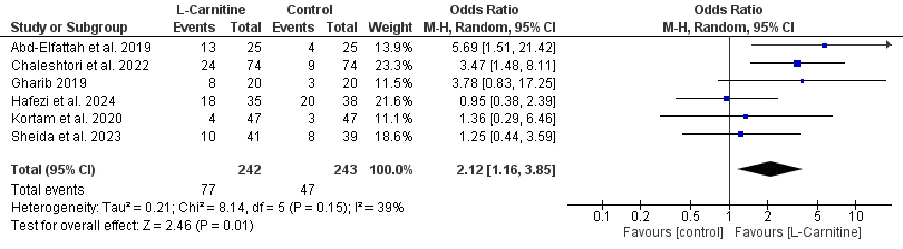 Figure 4 illustrates a significant increase in the clinical pregnancy rate among participants receiving L-carnitine compared with the control group (OR = 2.12, 95% CI 1.16–3.85, P = 0.01). The included studies demonstrated moderate heterogeneity (P = 0.15, I2 = 39%).