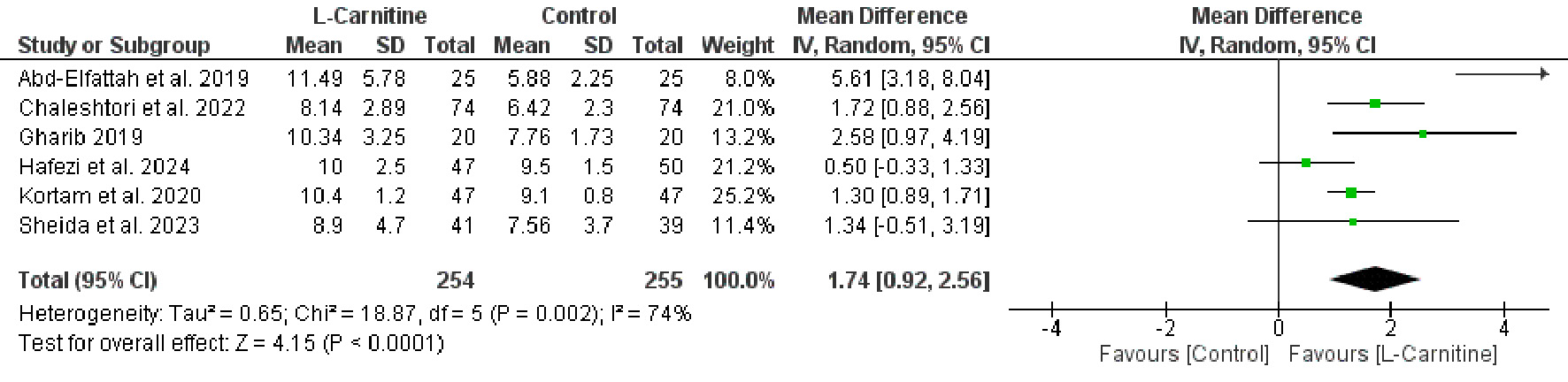 The mean endometrial thickness was significantly greater in the L-carnitine group than in the control group (MD = 1.74, 95% CI 0.92–2.56, P < 0.001), as depicted in Figure 5. Substantial heterogeneity was observed among the studies (P = 0.002, I2 = 74%). Sensitivity analysis performed by excluding one trial [17] reduced heterogeneity to a moderate level (P = 0.14, I2 = 43%), while maintaining statistical significance and yielding a more conservative estimate of improvement in endometrial thickness (MD = 1.33, 95% CI 0.80–1.86, P < 0.001).