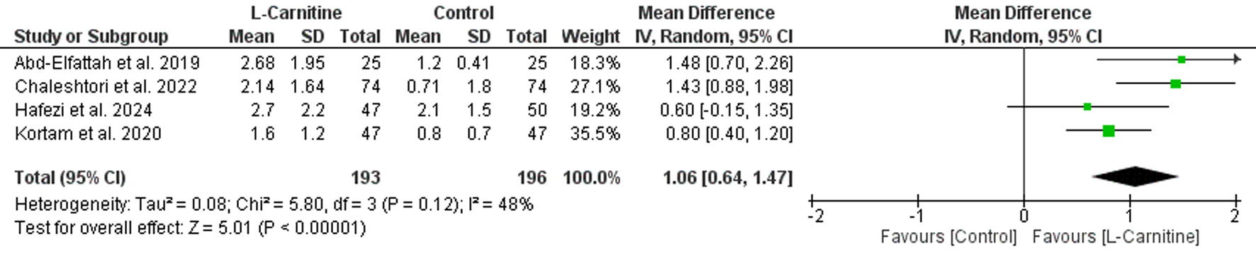 As shown in Figure 6, women receiving L-carnitine developed a significantly higher number of mature follicles compared with the control group (MD = 1.06, 95% CI 0.64–1.47, P < 0.001). The included studies demonstrated moderate heterogeneity (P = 0.12, I2 = 48%).