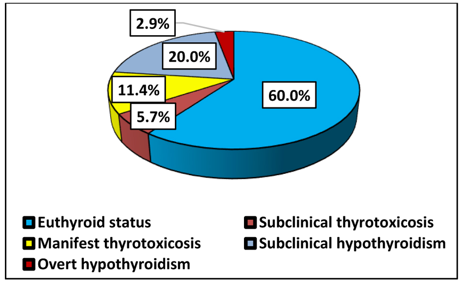 In the post-COVID group (n = 35), endocrine disturbances were frequently observed, predominantly in the form of autoimmune thyroid disorders. Based on TSH, FT3, and FT4 levels, 21 patients were euthyroid (60.0%), followed by subclinical hypothyroidism (20.0%), while overt dysfunction and thyrotoxic states were less common (Fig. 2). In line with these findings, levothyroxine therapy was initiated in 13 patients with clinically significant hypothyroid dysfunction. This distribution indicates a predominance of euthyroid and subclinically hypothyroid status in the post-COVID population, whereas thyrotoxic conditions were less frequently observed.