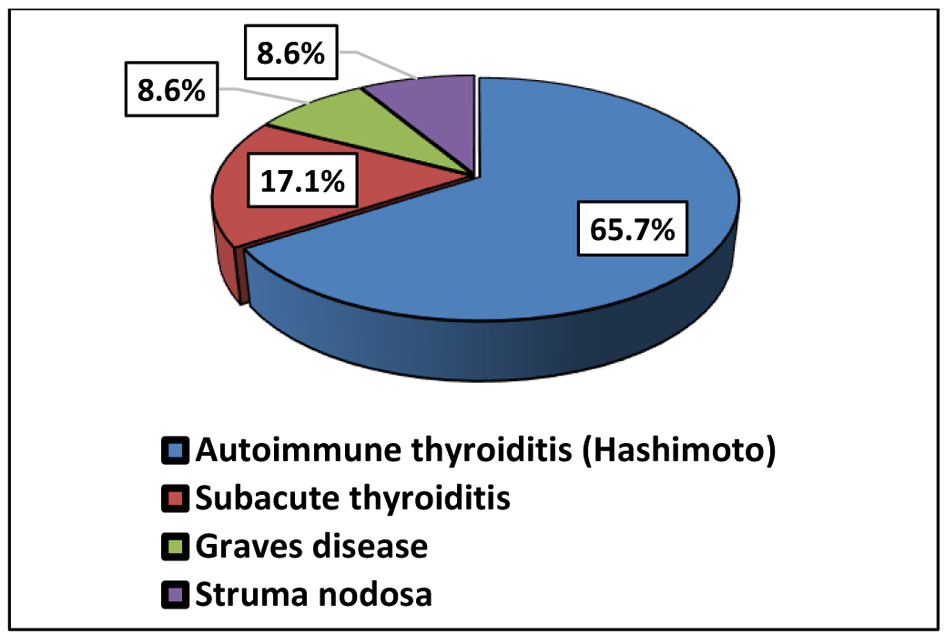 The most common diagnosis was Hashimoto’s thyroiditis, observed in 23 patients (65.7%), including one case of thyroid-associated ophthalmopathy (TAO), highlighting the potential for extrathyroidal immunological hyperreactivity in the post-infectious period. Subacute thyroiditis (17.1%) and Graves’ disease (8.6%) were less frequent, reflecting a broad spectrum of post-infectious thyroid involvement (Fig. 3).