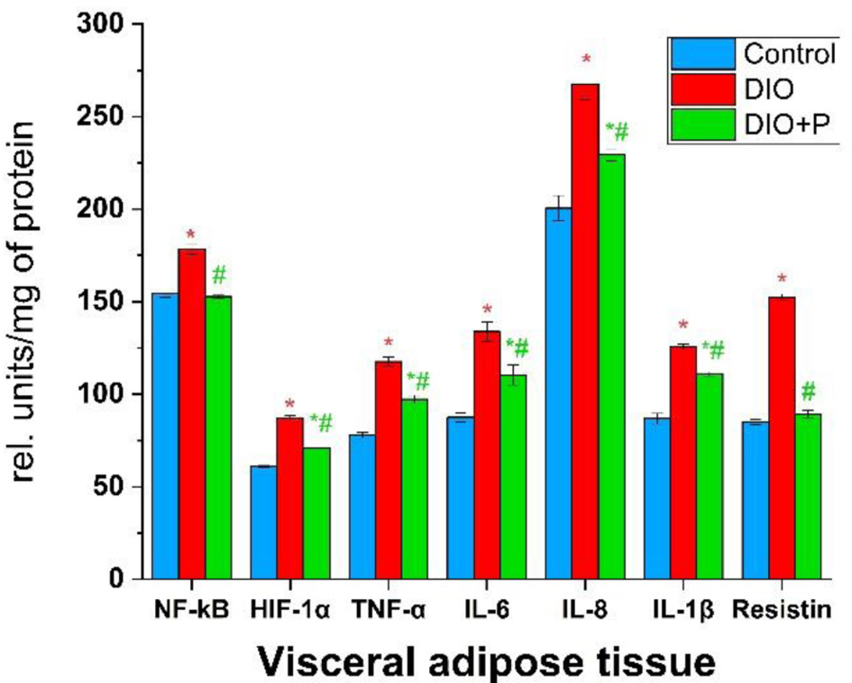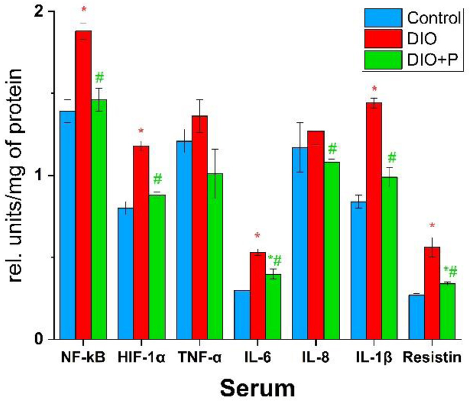 Moreover, according to our results, NF-κB concentration in the DIO group was elevated by 20%, TNF-α by 18%, IL-6 by 16%, and resistin by 13% (Fig. 4). In the DIO + P group, these parameters were reduced to the control values. However, the results did not show any statistically significant changes in IL-1β concentration.