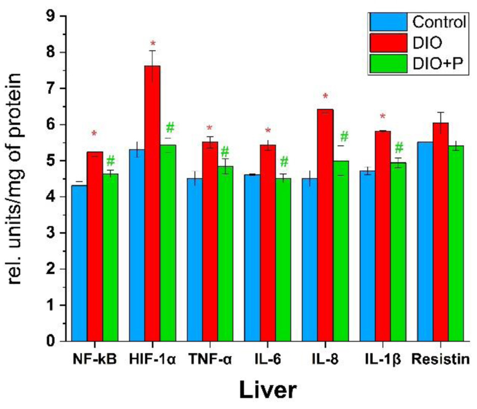 In our experiment, liver levels of HIF-1α and IL-8 in the DIO group were the highest among the assessed parameters, reaching 144% and 142% of the control values, respectively (Fig. 3). The same parameters in the DIO + P group were comparable to control levels.