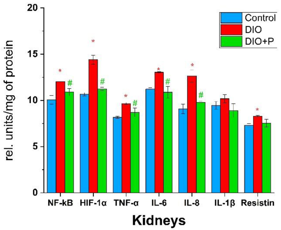 The smallest changes in cytokine profile were observed in kidney samples, yet the pattern of changes is similar to that observed in liver samples. Compared with the control group, the most significant deviation in DIO group was observed for IL-8 (138% of control values) and HIF-1α (135% of control values), yet in the DIO + P group, these values were in line with the control levels (Fig. 4).