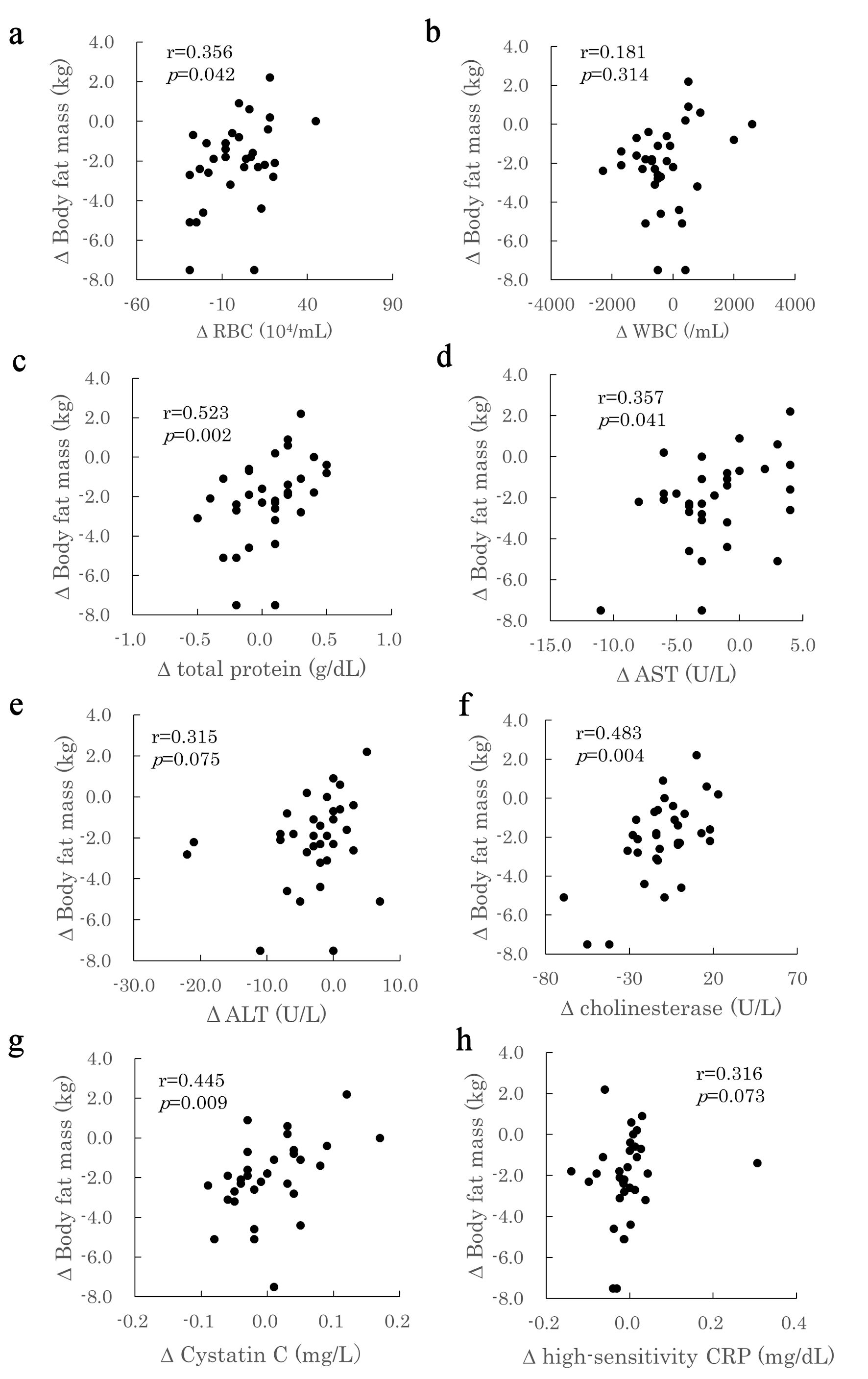![]() Click for large image | Figure 1. Correlation between changes in body fat mass and changes in blood parameters. The relationship between the change (Δ) in body fat mass (y) and the change (Δ) in various blood parameters (x) in study participants is shown. (a) ΔRed blood cell count (RBC); (b) ΔWhite blood cell count (WBC); (c) ΔTotal protein; (d) ΔAspartate aminotransferase (AST); (e) ΔAlanine aminotransferase (ALT); (f) ΔCholinesterase; (g) ΔCystatin C; (h) ΔHigh-sensitivity C-reactive protein (CRP). |